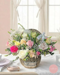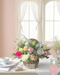Sweet, graceful, and endlessly charming — Pastel Whimsy Garden Basket features a soft medley of roses, carnations, spray blooms, and filler flowers in lovely shades of blush, cream, peach, and fuchsia. Adorned with lace and satin bows, this rustic woven basket brings a romantic countryside flair to any space.