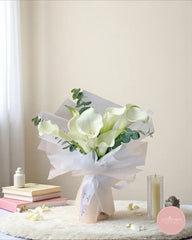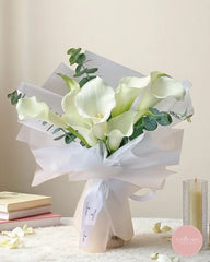 A timeless bouquet featuring pristine white calla lilies, beautifully complemented by fresh eucalyptus foliage. Wrapped in soft white paper and finished with a satin ribbon, this elegant design embodies purity, grace, and sophistication, making it a refined choice for any occasion.