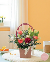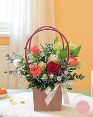Brimming with bold colour and rustic charm, this floral bag features a striking blend of fiery red and orange roses, sunny alstroemerias, creamy eustomas, daisies, and fresh eucalyptus greens. Artfully arranged in a kraft-style carrier with a warm ivory ribbon, it delivers an uplifting burst of energy and joy.