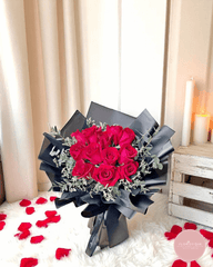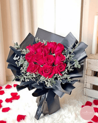 A timeless symbol of love and passion, this bouquet features a lush arrangement of fresh, velvety red roses surrounded by delicate white fillers and accented with fresh eucalyptus leaves. Elegantly wrapped in sleek black paper and tied with a matching ribbon, it exudes sophistication and romance.