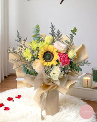 This captivating bouquet bursts with life, centering around a radiant sunflower. It's complemented by roses in shades of soft cream, blush pink, and deep crimson, creating a dynamic palette. Baby's breath and green foliage add freshness, all elegantly wrapped in a tan paper with a cascading ribbon, embodying vibrant elegance.