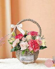 Brimming with soft pastel roses, vibrant carnations, and creamy eustoma, this charming basket arrangement exudes warmth and affection. Nestled in a rustic woven basket with a dainty ribbon detail, it captures the essence of a blooming garden in full cheer. Lush greenery adds a natural touch, making this design a delightful gift for birthdays, thank-you gestures, or simply brightening someone’s day.