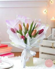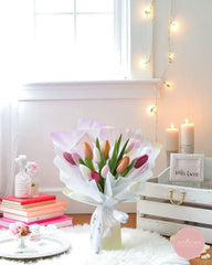 Bursting with charm and colour, this joyful bouquet showcases a radiant mix of tulips in white, pink, peach, orange, and red hues. Artfully arranged and wrapped in pearlescent pastel-toned paper, this delightful ensemble brings a touch of springtime magic to any setting. Perfect for birthdays, thank-you gifts, or to simply brighten someone’s day.