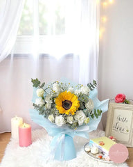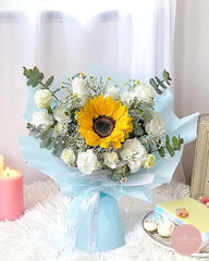 Brighten any space with our striking hand-tied arrangement, featuring a golden sunflower at its heart surrounded by creamy white spray roses, delicate lisianthus, and whisper-light fillers. Accented with silvery eucalyptus and wrapped in layers of pastel-blue and translucent paper, this bouquet exudes cheerful elegance and natural charm—perfect for housewarmings, thank-you gifts, or simply bringing sunshine into someone’s day.