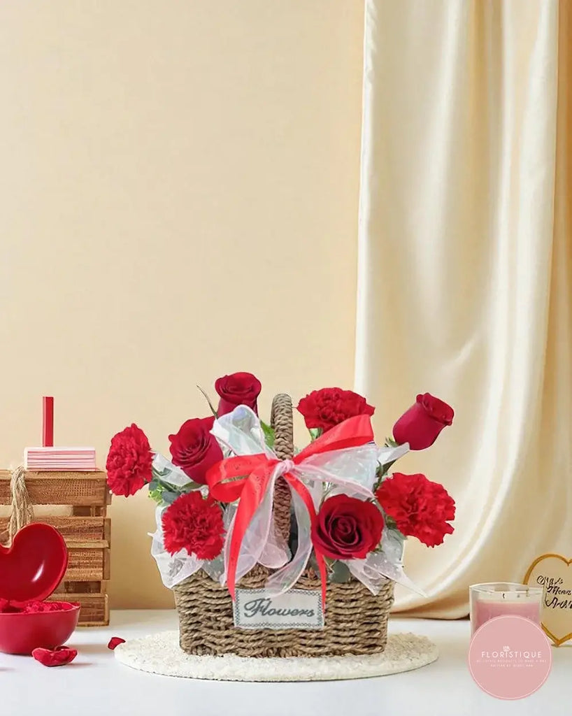 A bold medley of velvety red roses and passionate red carnations arranged in a charming rustic woven basket, topped with sheer white and vibrant red ribbons for a festive touch. This handcrafted arrangement exudes love, making it a perfect gift for romantic occasions, anniversaries, or Valentine’s Day.