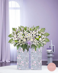 A serene tribute featuring pure white lilies, chrysanthemums, and soft lilac accents, this arrangement conveys heartfelt condolences with grace and dignity. Set against a lush backdrop of greenery, it's a comforting presence during times of loss.