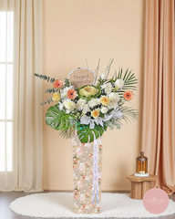 A graceful arrangement of creamy yellow roses, white chrysanthemums, and soft orange gerberas, elegantly paired with lush monstera leaves and eucalyptus. This condolence stand offers a gentle tribute, radiating warmth and remembrance during moments of grief.