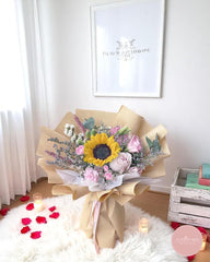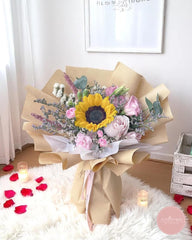 Our enchanting mixed floral bouquet features a vibrant sunflower surrounded by delicate pink roses, carnations, and lush greenery, all elegantly wrapped in a rustic brown paper ensemble. Perfect for any occasion, this bouquet brings joy and warmth, making it a wonderful gift.