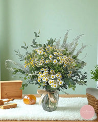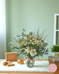 A charming display of fresh chamomile blooms, surrounded by soft green foliage and sprigs of white fillers. This vase arrangement radiates rustic elegance and countryside freshness, perfect for lifting spirits or adding a gentle accent to any space.