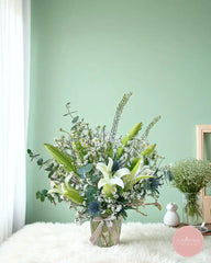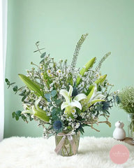 This elegant vase arrangement features serene white lilies paired with delicate chamomile, thistle, and sprigs of eucalyptus, creating a calming and refined composition. The lush green buds and soft textures add a touch of natural sophistication.