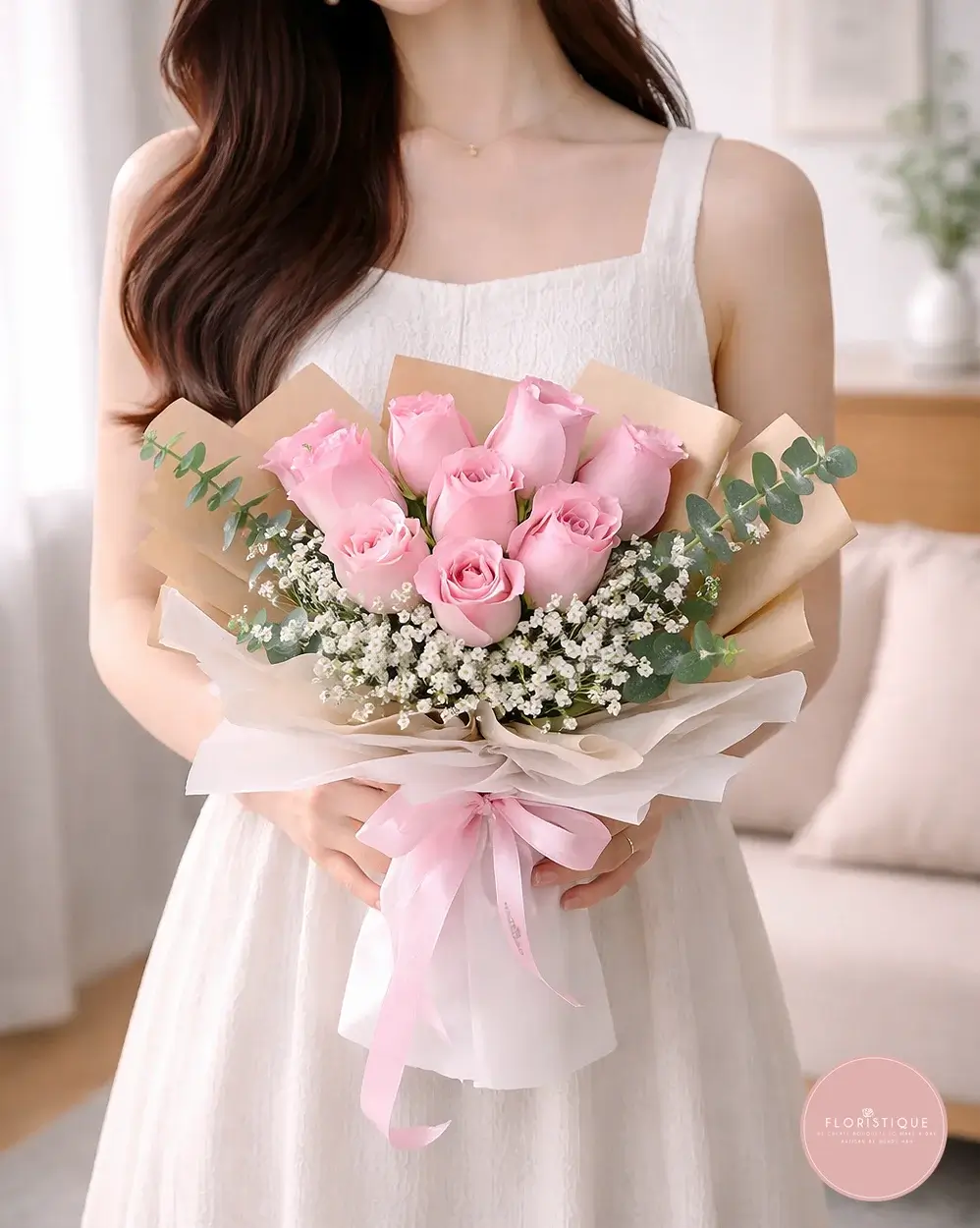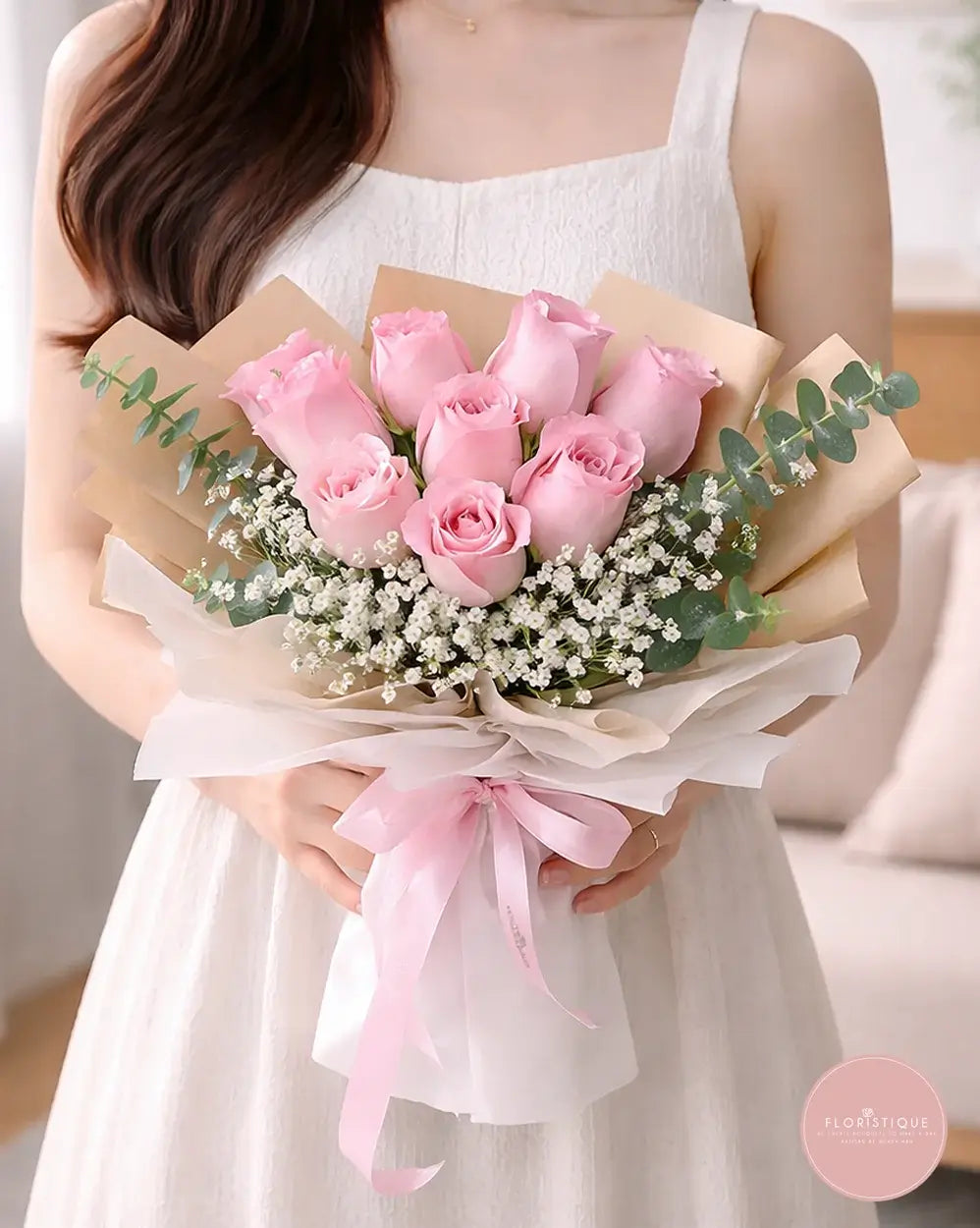 Indulge in the tender charm of our bouquet, showcasing 9 lovely pink roses adorned with delicate caspia. The soft hues and intricate arrangement create an elegant ensemble, perfect for expressing affection on birthdays, celebrations, or to brighten someone's day. Elevate the moment with this beautiful floral expression of grace and admiration.