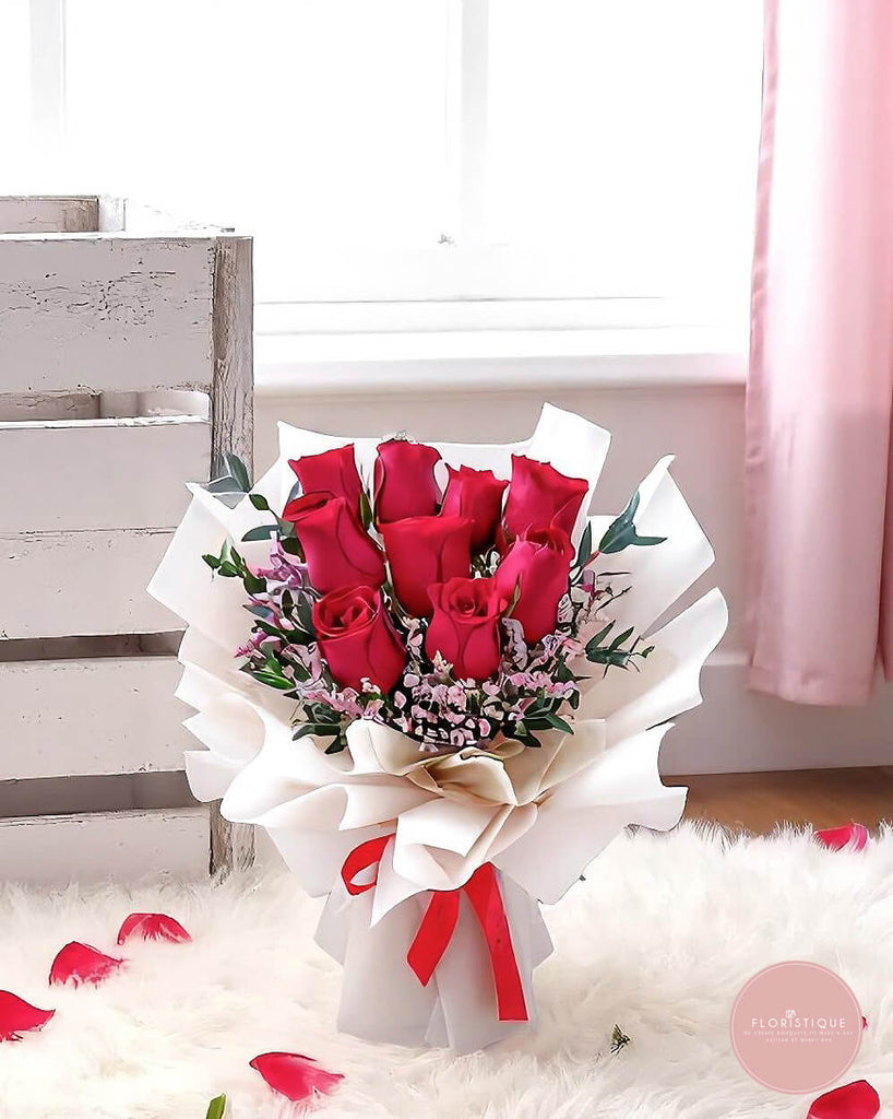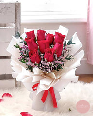 Unveil the allure of romance with this bouquet featuring nine luscious red roses accompanied by the delicate charm of pink caspia. Tastefully wrapped in nude-colored packaging, this arrangement balances passion and subtlety, making it an ideal gift for expressing love and appreciation.