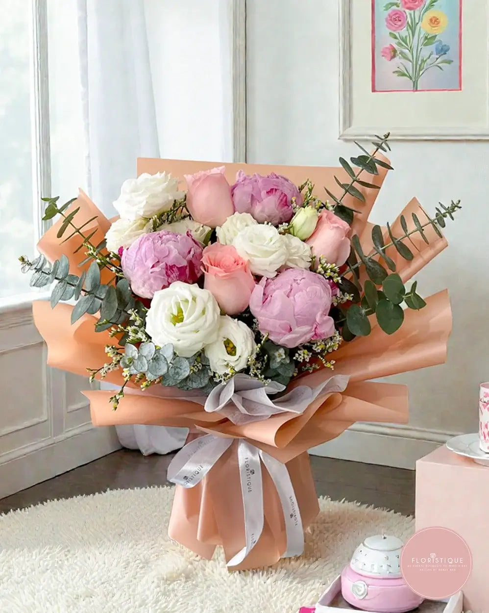 Soft, feminine, and full of charm, this bouquet features pastel pink peonies, creamy white roses, and blush-toned blooms delicately nestled among baby's breath and eucalyptus. Wrapped in romantic pink layers and tied with satin ribbon, this hand bouquet is a perfect expression of elegance and affection.