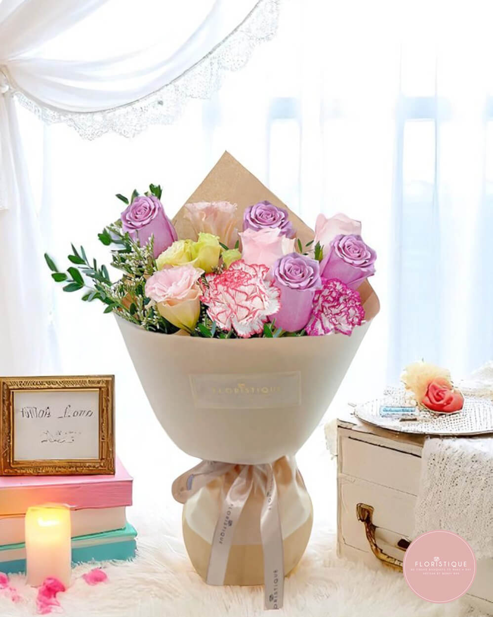 A dreamy pastel bouquet featuring a romantic blend of lavender roses, blush pink roses, creamy yellow blooms, and dainty pink carnations. Wrapped in soft-toned paper and tied with a satin ribbon, this bouquet radiates elegance, tenderness, and charm — perfect for celebrating life’s sweetest moments.