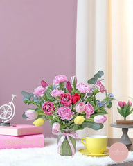 A lively burst of spring featuring pink, red, and yellow tulips paired with ruffled pink carnations and delicate filler blooms, all elegantly arranged in a clear glass vase. This cheerful composition brings a fresh, uplifting vibe perfect for birthdays, congratulations, or simply brightening someone’s day.