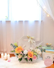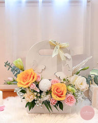 Brimming with warmth and charm, this delightful arrangement features golden yellow roses, blush pink spray carnations, champagne eustoma, and delicate baby’s breath. Presented in a soft beige bloom bag with butterfly cutouts and finished with a pale yellow ribbon, it captures the beauty of a sunlit morning.