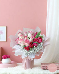 A graceful medley of soft pink-edged roses, bold red tulips, and delicate baby’s breath, this bouquet radiates affection and warmth. Wrapped in pastel pink with snowy white accents, it's a romantic gesture perfect for birthdays, anniversaries, or simply to say "I’m thinking of you."