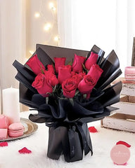 Wrapped in dramatic black paper, this luxurious hand-tied bouquet showcases a dozen velvety red roses, each stem selected for its deep hue and long-lasting freshness. The sleek monochrome presentation highlights the classic beauty of the blooms—perfect for romantic gestures, Valentine’s Day, or adding a bold statement to any celebration.