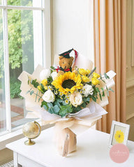 Celebrate a proud achievement with this joyful graduation bouquet featuring a bright sunflower, sunny yellow spray roses, creamy white blooms, and chamomile, accented with eucalyptus and topped with an adorable graduation bear. Wrapped in warm ivory tones, it’s a perfect blend of charm and congratulations.