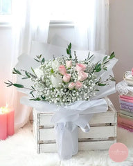 A dreamy hand-tied bouquet where pure white tulips and soft pink spray roses emerge from a cloud of delicate baby’s breath, artfully accented with verdant eucalyptus. Wrapped in crisp white papers and finished with a flowing ribbon, this arrangement blends gentle romance with timeless elegance—perfect for anniversaries, thank-you gifts, or simply to brighten someone’s day.