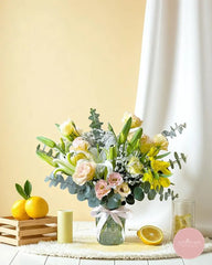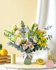 This radiant vase arrangement features a graceful medley of sunny yellow alstroemeria, elegant white lilies, and soft champagne lisianthus, beautifully complemented by fresh eucalyptus. A cheerful and uplifting bouquet that brings brightness and elegance to any space.