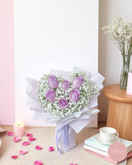 Delicate and graceful, this arrangement showcases six enchanting lavender roses nestled within a bed of airy white baby’s breath. Wrapped in soft lilac tones, it evokes a sense of calm elegance and admiration — perfect for birthdays, congratulations, or as a tender gesture of love.