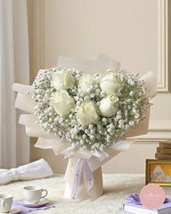 Elegantly arranged with six pristine white roses nestled in a cloud of dainty baby’s breath, this heart-shaped bouquet exudes sincerity, peace, and grace. A timeless gesture for weddings, farewells, or heartfelt sentiments.