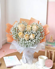 This heart-shaped arrangement of soft peach roses surrounded by a delicate sea of baby’s breath offers a gentle and refined expression of affection. The warm hues speak of admiration, appreciation, and sweet beginnings.