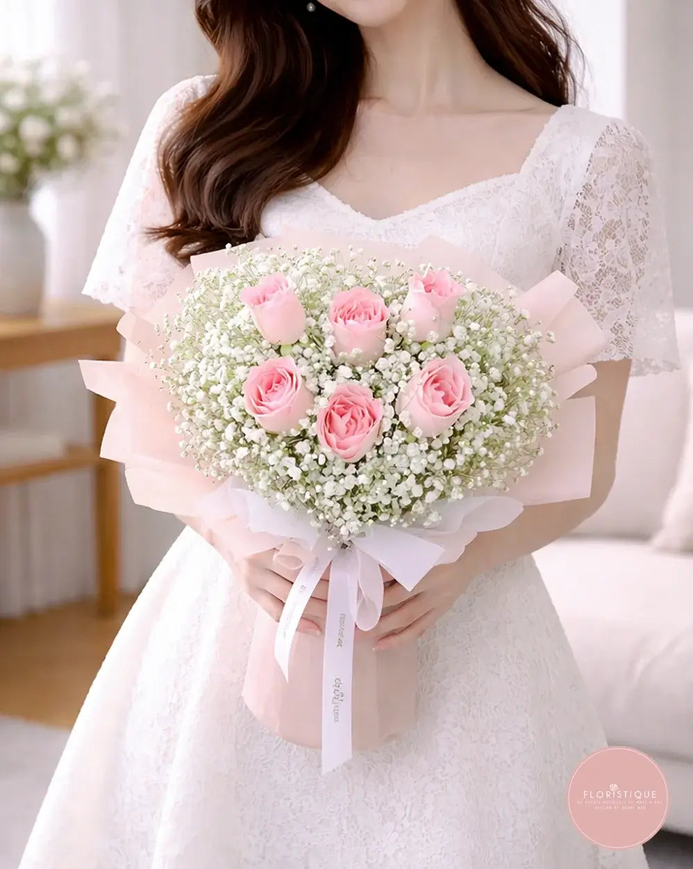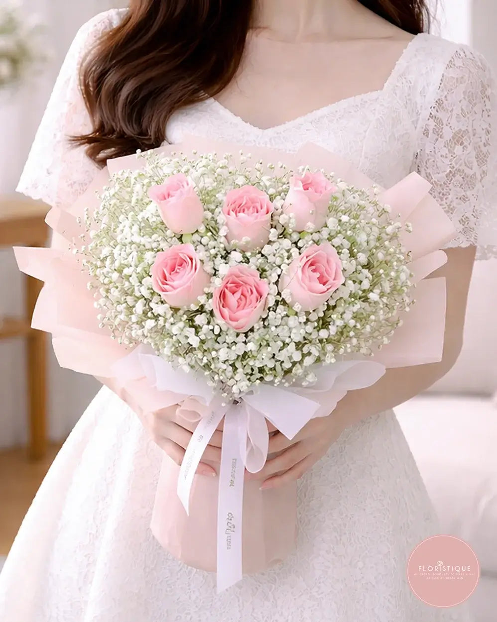 Delicately arranged with six soft pink roses nestled in a dreamy cloud of baby’s breath, this bouquet radiates tenderness and grace. Wrapped in elegant blush tones, it’s a timeless choice for anniversaries, birthdays, or heartfelt expressions of love.