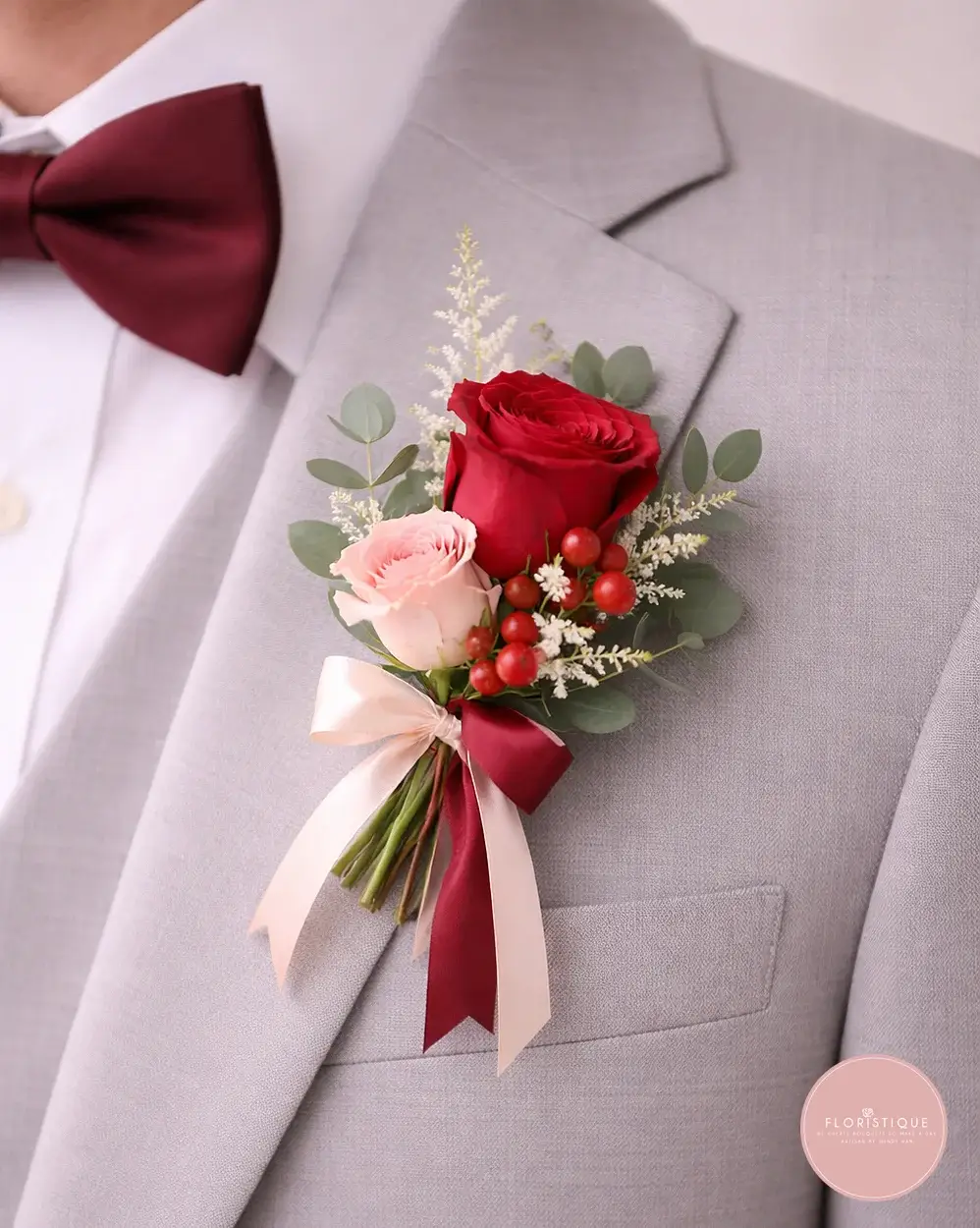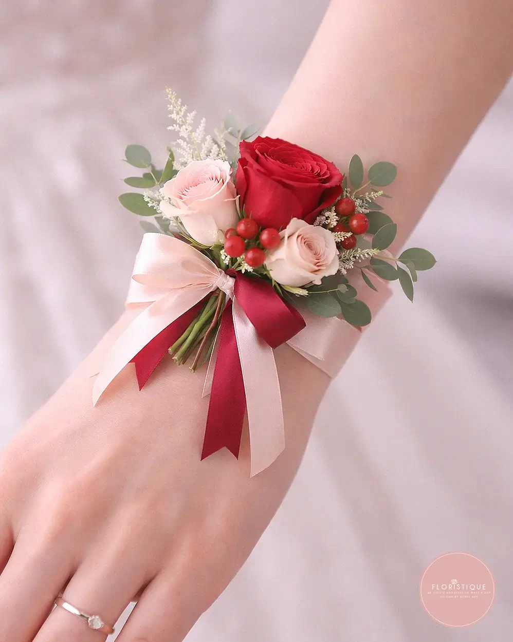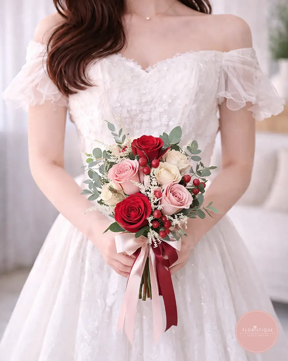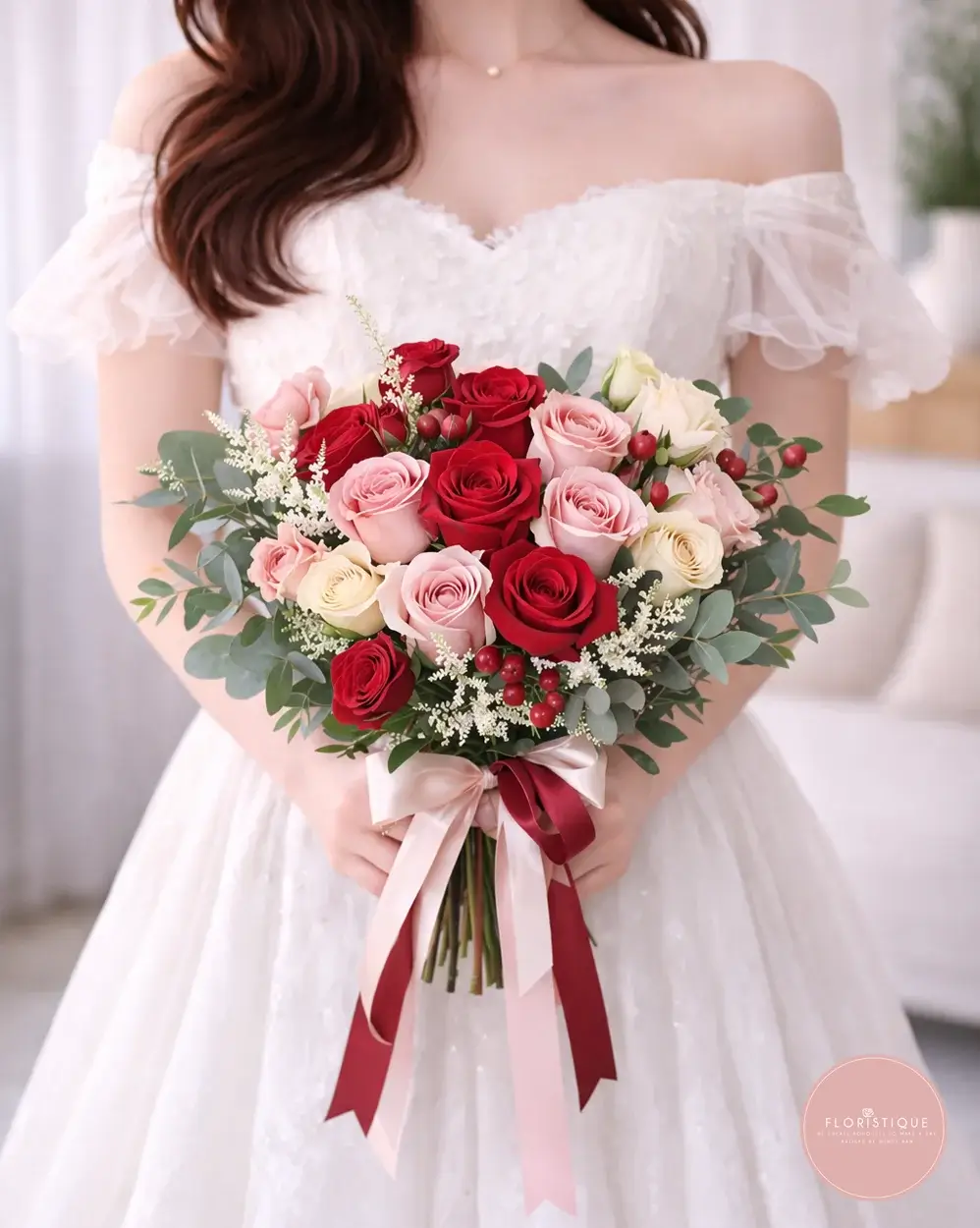 This exquisite bridal set showcases a romantic blend of velvety red roses, soft blush pink roses, and creamy ivory blooms, beautifully accented with delicate filler flowers, fresh eucalyptus foliage, and subtle berry details. The harmonious balance of rich and pastel tones creates a lush, full-bodied composition, styled with an airy elegance that complements the bride’s natural grace.