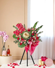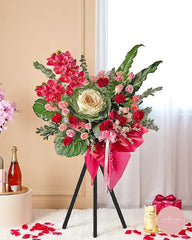 Celebrate bold beginnings with this eye-catching grand opening flower stand, featuring a luxurious mix of red and pink roses, cymbidium orchids, delicate eustomas, and a unique ornamental cabbage bloom. Wrapped in vibrant hot pink and finished with a satin bow, this arrangement exudes confidence and charm.