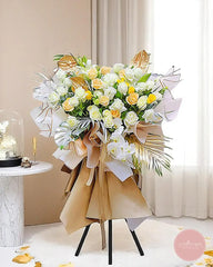 A vision of elegance and sophistication, this grand opening flower stand showcases a stunning blend of champagne and ivory roses, white lilies, and delicate orchids. Accented with metallic gold and silver foliage, and wrapped in soft beige and cream tones, this arrangement exudes luxury and timeless charm.