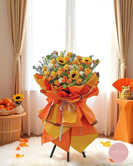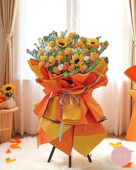 Lively and full of zest, this grand opening flower stand features a vibrant blend of sunflowers, orange spray roses, white eustomas, and yellow carnations. Wrapped in bold layers of tangerine and golden yellow, this cheerful arrangement radiates energy, enthusiasm, and new opportunities.
