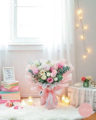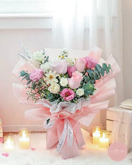 A soft and charming arrangement of blush pink roses, cream-toned blooms, and sprigs of eucalyptus, elegantly wrapped in pastel pink. This bouquet exudes femininity and grace—perfect for celebrating love, welcoming new beginnings, or simply brightening someone’s day.