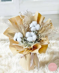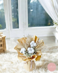 Minimalist and chic, this bouquet highlights fluffy cotton with pampas, baby’s breath and soft grains, bundled in rustic kraft for effortless Scandinavian vibes. Its warm neutrals complement modern and boho interiors alike, making it a stylish décor piece and a thoughtful “thank you.” Preserved and dried elements keep it beautiful for months with simple care.