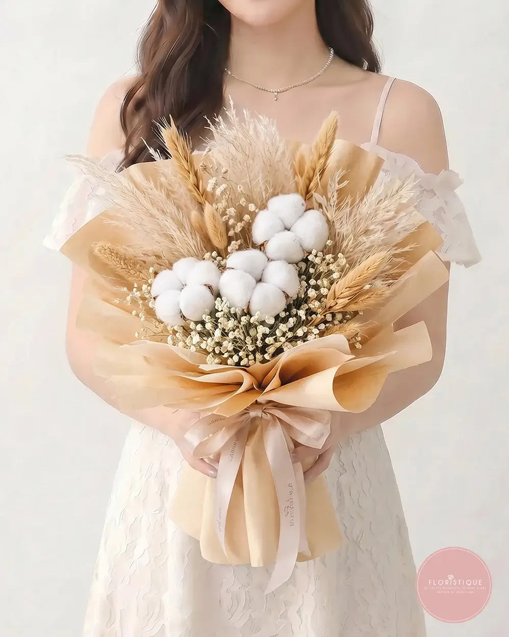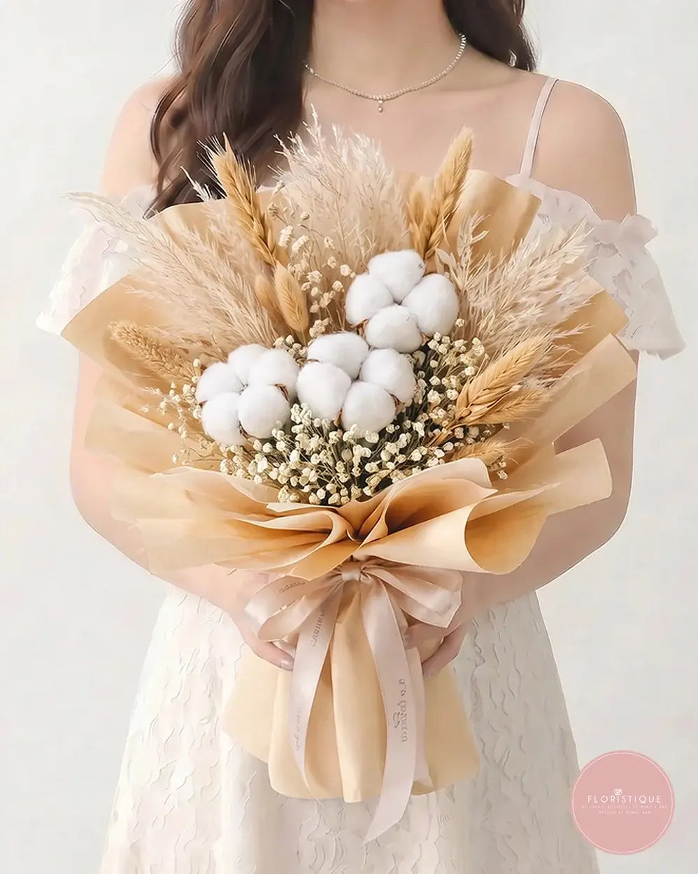 Soft, elegant, and full of natural charm, this bouquet features fluffy cotton blooms paired with dried baby’s breath, pampas grass, and wheat accents in warm neutral tones. Wrapped in natural kraft paper and finished with a soft beige ribbon, it makes a timeless and thoughtful gift for any occasion.
