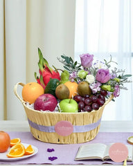 Bursting with vibrant colours and nourishing goodness, this delightful fruit hamper features a handpicked selection of premium fruits—dragon fruit, avocado, orange, red apple, green apple, kiwi, and grapes—paired with elegant sprigs of fresh florals in purple and lilac tones. Nestled in a woven keepsake basket with a charming gingham ribbon, this arrangement brings the perfect balance of health and beauty.
