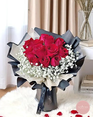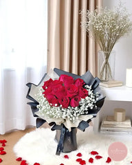 A bold and elegant arrangement of red roses paired with delicate baby’s breath, wrapped in sleek black and cream-toned layers for a striking contrast. Perfect for anniversaries, romantic milestones, or any heartfelt gesture that calls for timeless beauty.