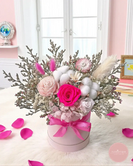 Delicate and lasting, this arrangement features vibrant preserved roses in shades of pink, paired with cotton, dried foliage, and dainty fillers. Beautifully presented in a pastel hatbox with a satin ribbon, it’s a stylish keepsake that adds charm to any home or makes a thoughtful gift.