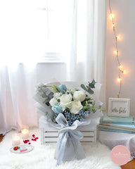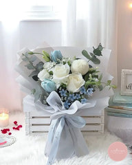 Order your Azure Tranquility Bouquet today from Singapore’s premier florist for reliable white rose bouquet delivery Singapore-wide, blue flower bouquet delivery Singapore, and same-day flower delivery islandwide!