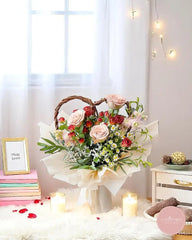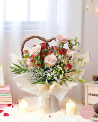 This heart-shaped rustic bouquet is a whimsical celebration of romance and charm. Featuring blush roses, petite red spray roses, soft pink alstroemeria, and delicate chamomile blooms, it’s adorned with fresh greenery and framed by a handcrafted rattan heart.
