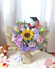 Celebrate a proud milestone with this radiant bouquet featuring a cheerful sunflower at its heart, surrounded by pastel roses, eustoma, carnations, and lush fillers. Topped with an adorable plush bear in graduation attire, this arrangement makes the perfect gift to mark a moment of achievement and joy.