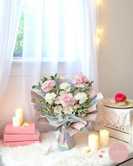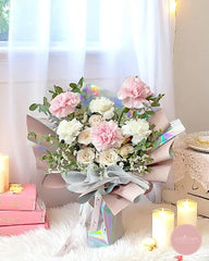 A dreamy composition of blush pink and ivory carnations, soft champagne roses, and dainty wax flowers, elegantly framed with eucalyptus greens. Wrapped in shimmering holographic paper and muted tones, this bouquet is a vision of grace and serenity.
