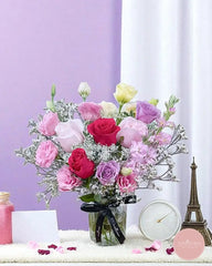 A cheerful and romantic ensemble, this vase arrangement features a medley of vibrant red, soft pink, lavender, and cream roses, beautifully accompanied by lisianthus, baby’s breath, and delicate fillers. The combination of colours evokes warmth and joy, making it a perfect gift for celebrations or heartfelt surprises.