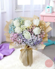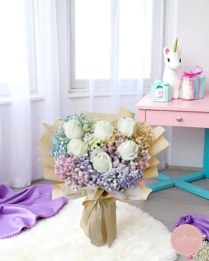 This enchanting bouquet pairs elegant white roses with a vibrant mix of pastel-hued baby’s breath in shades of blue, lilac, peach, pink, and lemon yellow. Wrapped in warm kraft and cream-toned layers, it radiates joy and softness—perfect for birthdays, friendship gifts, or simply brightening someone’s day.