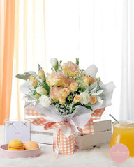 Brimming with cheerful yellow and cream eustomas and spray roses, this joyful bouquet is accented with dainty fillers and soft dusty miller leaves, all wrapped in crisp white paper and finished with a delightful orange gingham ribbon. Light, lively, and full of charm — perfect for birthdays, celebrations, or to brighten any day.