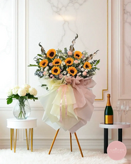 Bright and uplifting, this grand opening flower stand features radiant sunflowers, soft pink roses, and elegant white eustomas, accented with lush greens and shimmering gold leaves. Wrapped in layers of buttery peach fabric with a delicate pink ribbon, it’s a beautiful symbol of growth, joy, and new beginnings.