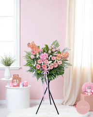 Delicate and graceful, this grand opening flower stand features a lovely medley of soft pink gerberas, roses, orchids, tulips, and a central hydrangea bloom. Surrounded by lush greenery and finished with a pink satin ribbon, this arrangement radiates elegance, warmth, and heartfelt celebration.