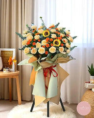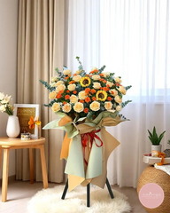 Charming and full of warmth, this grand opening flower stand features a cheerful mix of sunflowers, cream roses, and orange spray roses, arranged with lush eucalyptus and elegant wrapping in muted gold and sage tones. Finished with a classic red ribbon, this arrangement radiates joy, success, and heartfelt celebration.