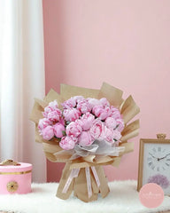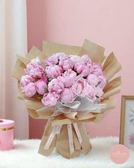 Overflowing with luscious pink peonies in full bloom, this stunning bouquet makes a bold yet elegant statement. Nestled in rustic kraft wrapping and accented with delicate tulle, it radiates charm, romance, and heartfelt emotion—ideal for anniversaries, birthdays, or simply to say "you’re cherished."